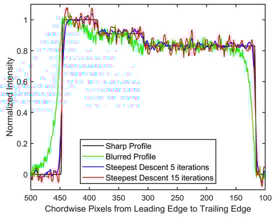 A zoomed-in version at the leading and trailing edges is shown in Figure 10 to show this effect of iteration count. High-spatial resolution reconstructions with high-frequency information are possible, as long as elevated noise levels can be tolerated (such as in high SNR experiments). The invariant case was excluded from this comparison due to the large amount of noise in the ‘restored’ image, but is considered in the next noise-free test case. Another feature to be noted is the effect of 2-norm-based regularization (Equation (6)) on the leading edge of the image. It has been known that 2-norm-based methods do not allow sharp gradients and produce smoother results [20]. Since important flow physics often have a first-order effect on the surface pressures near the leading edge of an airfoil, it is critical that a form of regularization that does not smooth out the intensity values be used to acquire the pressure information there. The total variation smoothing norm, which is based on 1-norm of the image gradients [48,49] is less harsh on gradients, and may be used to preserve the leading edge information in future work.