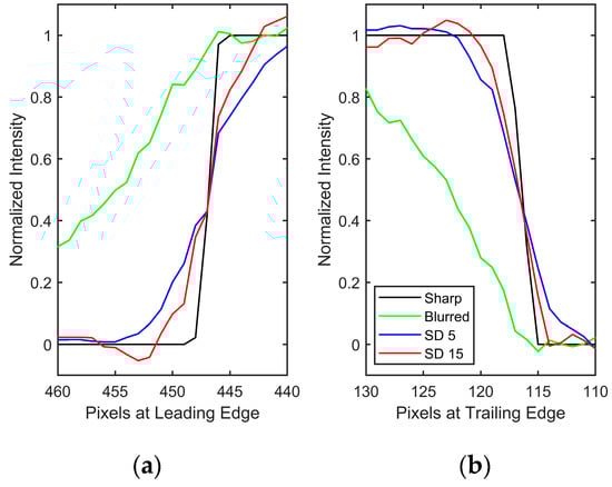 Comparison at the interface of 90 kPa and 70 kPa at r/R=0.95 at the (a) leading edge and (b) trailing edge. Rotation is toward increasing pixel values.