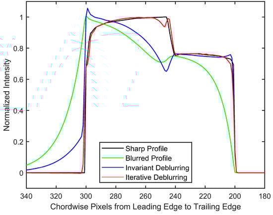 Deconvolution-based deblurring methods, on the other hand, are post-processing methods that seek to minimize the blur in the captured images. Since no camera–mirror alignment is required, these methods are economical and save wind-tunnel testing time. These are also applicable at different speeds and movement types, where a particular type of mirror might fail. In the comparative study of Pandey et al. [16], it was shown that when working with good luminescent signal levels, both derotation and deblurring methods are equally effective at blur elimination. This technique has been used in single-shot PSP [7,8,11,12] and TSP measurements [12,16]. The focus of this work is on improving upon the deconvolution-based method for application with sharp pressure gradients such as the identification of the location of a shock on a rotor blade. The deblurring method currently being used assumes a uniform invariant blur at all of the points on the image. However, in actuality, the blur at every pixel dependents on the local pressure, which is spatially varying, and the invariant deblurring method fails when sharp pressure differentials are present [8]. Moreover, the assumed value of point spread function (PSF) might not be appropriate, which would lead to an inaccurate restoration of the blurred image. In the following section, the motivation for the current work is provided by reviewing the technical difficulties of the problem at hand, and the inadequacy of the current state-of-the-art deblurring algorithms at addressing it.