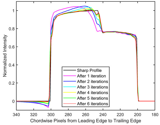 The polar lattice had a resolution of 0.5/pixel and 0.1/pixel in the radial and azimuthal directions, respectively. Due to the absence of noise, both invariant-supposed and spatially varying blind deconvolutions were simply carried out through the backslash operator in MATLAB. The results are shown in Figure 12. It can be observed that the assumed pressure of one atmosphere, as shown in Figure 12 c, is unable to restore the location of the shock, and brings to attention the inability of the invariant deblurring method when applied to PSP images with strong variations in pressure. On the other hand, the iterative method shows both qualitative and quantitative similarity to the initial intensity profile as not only the location, but also the intensity values are restored. This is more prominently seen in the intensity plot at r/R = 0.95 (Figure 13). The quality of restoration is very fine, as all of the pressure differentials are restored to correct locations, although a few differences in intensity values can be observed (particularly near the shock front). The intensity values after the first six iterations are shown in Figure 14, which shows that the convergence to a sharp image is expeditious.