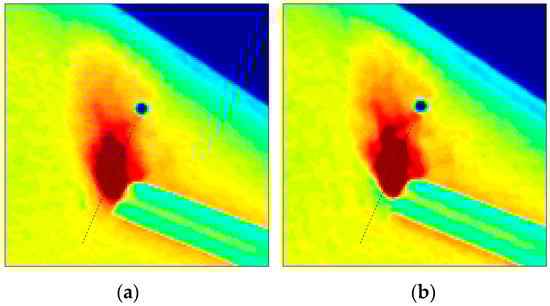 here, and are the reference values of intensity and pressure, respectively, taken at a “wind off” reference condition, in order to counter the spatial intensity variations due to non-uniform paint thickness or illumination, which cancel out in the intensity ratio. The calibration coefficients A and B are typically functions of temperature. Improvements in the oxygen permeability of binders has led to the development of fast-responding versions of PSP (Fast-PSP), which enable measurements of unsteady pressure fields [3]. Polymer–ceramic pressure-sensitive paint (PC-PSP) is a commonly used Fast-PSP with response times as low as 100 µs [9,10], and has been used to study unsteady aerodynamic phenomena acting on rotating surfaces [4,7,11]. To enable this application, a single-shot lifetime method based on pulsed laser excitation was developed in order to counter inherent problems such as the shot-to-shot variation of laser illumination, the cycle-to-cycle variation of wind-on positions, and the qualification of unsteady content not periodic with rotation frequency. This single-shot method employs a charge-coupled device (CCD) camera with a short first exposure of controlled duration, for referencing the subsequent long open-ended second pressure-sensitive gate. For resolving helicopter aerodynamic problems of interest using this self-referencing lifetime-based method, platinum porphyrin (PtTFPP) in polymer/ceramic has been used for the PSP [9], which has good sensitivity at the cost of a longer lifetime of luminescent emission. Temperature-sensitive paint (TSP) operates using the same principle of luminescence quenching, but due to thermal effects, has also been used on rotor blades in single-shot mode for temperature measurements [11,12].