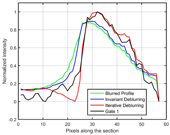 The intensity values of pixels on a section passing through the jet tangential to the sense of rotation are plotted in Figure 16. For comparison, the intensity profile from Gate 1 is also plotted, since it undergoes negligible blurring due to the short exposure of 5 µs, and when normalized serves as the true intensity profile that needs to be recovered. Since the accumulated intensity is different in the two gates, Gate 1 has been normalized by itself, whereas the blurred and deblurred Gate 2 profiles have been normalized by the iteratively deblurred profile. The plot demonstrates that due to the spatial variation in pressure, invariant deblurring using a PSF based on the assumption of uniform pressure of one atmosphere is unable to restore the intensity values to their original location. Correspondingly, the location of the sharp gradient is erroneous, and is close to that indicated by the blurred image. On the other hand, iterative deblurring is able to identify the exact location of the sharp pressure change, and the profile matches closely with the unblurred Gate 1 profile.