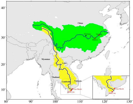 Map of the Yangtze River Basin (green region) and the Mekong River basin (yellow region) with selected stations in red dots located near the river estuary in this study.