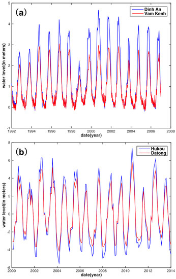 (a) Time series of water level at Dinh An (blue) station and Vam Kenh (red) station in the Mekong River Basin (MRB); (b) Time series of water level in Hukou (blue) station and Datong (red) station in the Yangtze River Basin (YRB).