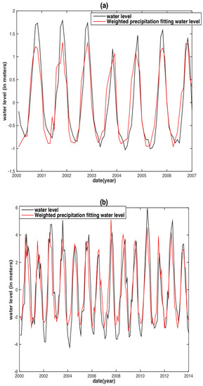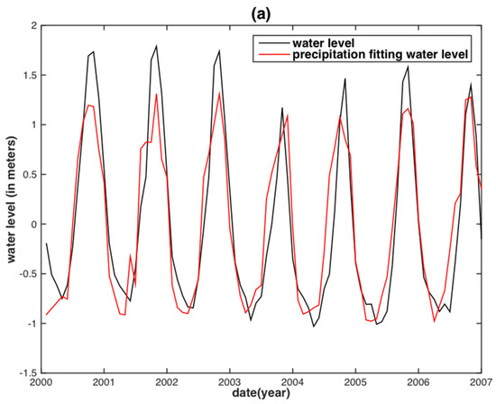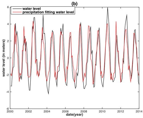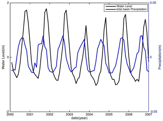 In fact, different empirical relationships between WL and precipitation based on ground observations and remote sensing data have been established in recent years [35,36,37]. For instance, significant correlations between the WL and the precipitation were found no matter in the upper, middle and lower Chalk of southern England [35]. Jiang et al. [36] found that a higher summer precipitation increased the summer runoff rate in the lower Yangtze River Basin between 1961 and 2000. Awange et al. [37] found that 80% of the WL falling in Lake Victoria was directly related to precipitation levels.