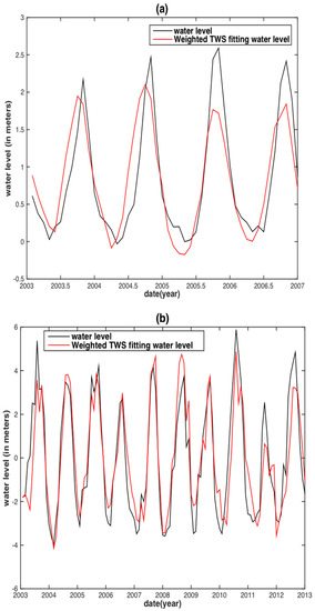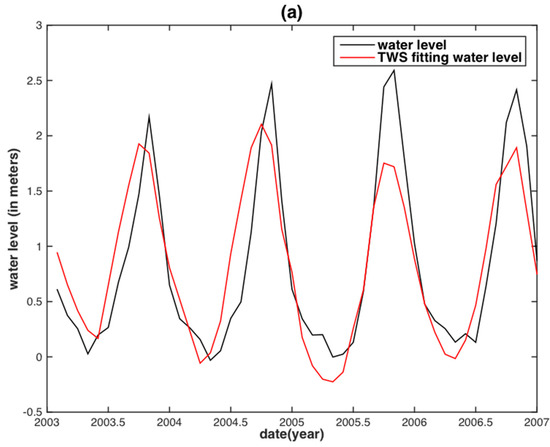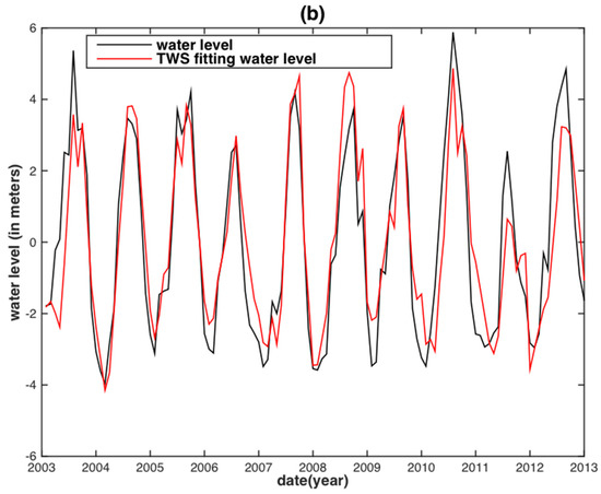 To assess the correlation of the internal assessment, the correlative relationships between the observed monthly WL and the two hydrological variables were obtained by linear regression (i.e., fitting with an offset plus slope). The regression would then be used to predict the WL in the two separate basins (Figure 4 and Figure 5). Both TRMM precipitation and GRACE TWS reconstructed WLs are in agreement with the observed WL. However, for the MRB, almost all WL peaks between the TRMM precipitation reconstructed WL and the observed WL displayed large discrepancies, except for the years 2003 and 2007 (Figure 4a). The GRACE TWS reconstructed WL shares both similar results with that of its precipitation counterpart. In addition, a time delay shorter than one month between the GRACE TWS reconstructed WL and observed WL is displayed (Figure 5a). For the YRB, the TRMM precipitation reconstructed WL has obvious underestimations occurring in the years of 2002, 2003, 2010 and 2012 (Figure 4b), whereas the GRACE TWS-derived WL is underestimated in the years of 2003, 2010, 2011 and 2012 (Figure 5b).