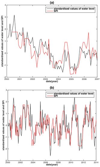 Multiple time-scaled SPI is a useful drought index that quantifies different types of drought events. For instance, the SPI on scales of 2–6 months can best capture the river discharge; the ground WL can be illustrated well by a 5–24 months time-scaled SPI; and the information of agricultural drought can be best described by the SPI with time scales of 2–3 months [65,66]. Owing to its applicability, the SPI based on gamma distribution was adopted and calculated using the TRMM monthly precipitation data product. Note that TRMM data time spans between 2000 and 2013 were used, while a 30-year continuous precipitation time series is desirable for a long-period signal.