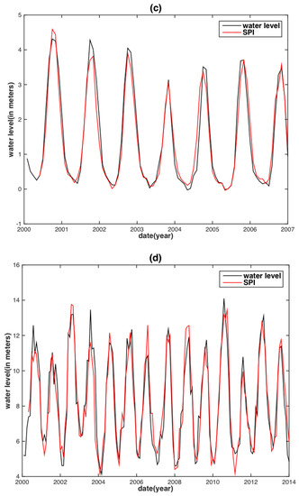 The TRMM-SPI shares the same tendency with the SWL in both the MRB and the YRB despite some minor differences (Figure 6a,b). The TRMM-SPI reconstructed WL for the two basins shows almost perfect agreement with their corresponding observed WL, except for several slight discrepancies of WL peaks (Figure 6c,d). Note that the best time scales of TRMM-SPI to reconstruct WL are five months for the MRB and four months for the YRB. This result shows a consistency with the findings from previous studies as described in Section 3.1. Contrary to the subjective choice for the best time scales of TRMM-SPI, no time scale is needed from GRACE-DSI, as it is simply calculated from the standardization formulae (i.e., Equation (5)). A similar performance of GRACE-DSI is achieved when compared to TRMM-SPI (Figure 7c,d).