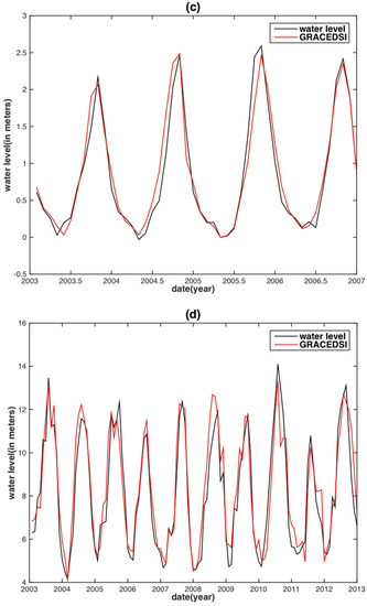 The launch of the Gravity Recovery and Climate Experiment (GRACE) enabled us to compute a global monthly Equivalent Water Height (EWH) (i.e., TWS) with a spatial resolution of 3° from the time-variable gravity observations (e.g., [67,68]). The degree-60 GRACE Level-2 Release 05 (RL05) monthly gravity data products, in the form of spherical harmonic coefficients (SHC), allow us to compute the EWH at a regular grid. These data can be obtained from GeoForschungsZentrum (GFZ) (ftp://rz-vm152.gfz-potsdam.de/grace/). The choice of GFZ L2 products is made because the calibrated uncertainties of the spherical harmonics coefficients (SHCs) are available [69]. The time span of the SHCs covered January 2003 to December 2013, with missing SHCs for January 2004, January 2011, June 2011, May 2012, October 2012. According to the result from Swenson et al. [70], the degree-one coefficients were added to account for the geocenter motion, whereas the C20 term was replaced in the GRACE data by the Satellite Laser Ranging (SLR) results [71] before deriving EWH. To lower uncertainties of EWH at a higher degree resulting from spatially correlated errors [72], a destriping process [73] and Gaussian filtering with a radius of 350 km were applied [74]. After these pre-processing procedures, monthly EWHs were used to either directly correlate with the ground-based observed WL or to derive the corresponding drought index (called GRACE Drought Severity Index (GRACE-DSI)) followed by correlating with the observed WL in this study.
