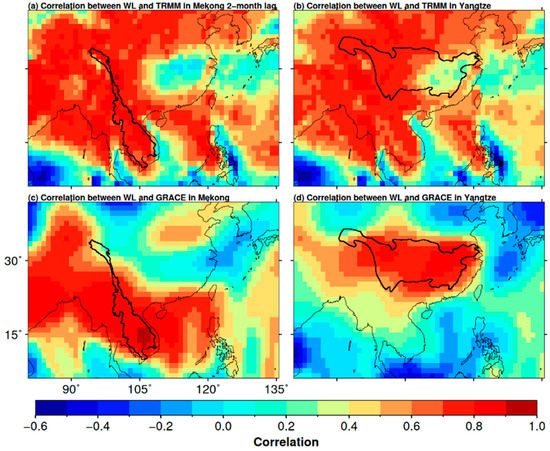 Correlation between remotely sensed TRMM precipitation and the observed water level in the MRB (a) and the YRB (b); The correlation between GRACE TWS and the observed the water level in the MRB (c) and the YRB (d). Note that the left-top panel (a) represents that the precipitation time series shifts two months forward before correlating with the observed water level.