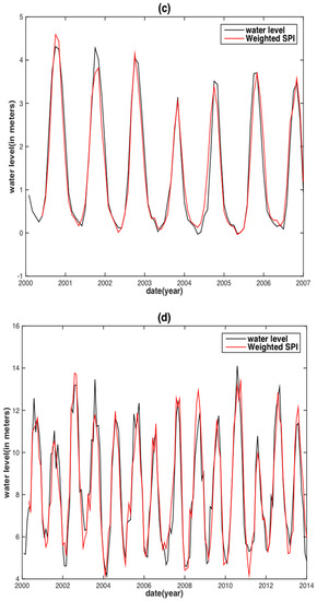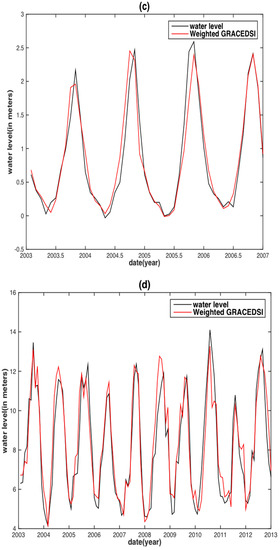 For the YRB, the correlation between TRMM precipitation and the WL ranges from 0.3 in the lower to 0.8 in the upper basin (Figure 8b). The lower YRB is affected by the EASM, which has significant impact on rainfall [50,56] and may cause the changes of rainfall in terms of start time, duration and intensity. This finding may be responsible for the relatively low correlation between precipitation and the WL in the lower basin in addition to intensive human activities in the lower YRB. In general, the TWS is highly correlated with the WL for the entire YRB (Figure 8d). Therefore, we anticipate the relationship of precipitation (with its derived TRMM-SPI) or TWS (with its derived GRACE-DSI) with the WL is strengthened by the weighting factor based on correlations, and hence, the performance of WL reconstruction should be improved.