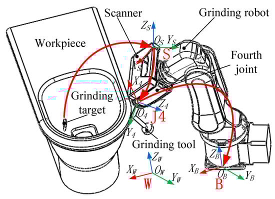 Figure 1 shows the hardware architecture of the grinding robot 3D vision system proposed in this paper, including the grinding robot and the 3D scanner fixed on the grinding robot’s fourth joint. The frames involved include the world frame (W), the robot base frame (B), the robot’s fourth joint frame (J4), and the scanner frame (S). Where B and W are usually coincident.