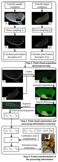 Section 3 introduces the mathematical basis of the grinding robot 3D vision system. In this section, the data processing process for detecting the machining target using the 3D vision system is described, as shown in Figure 2.