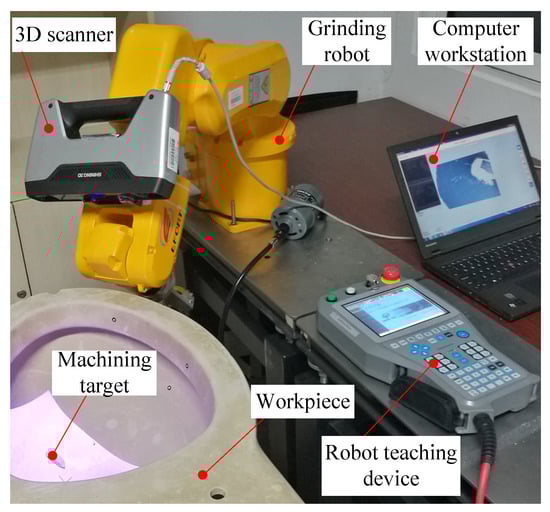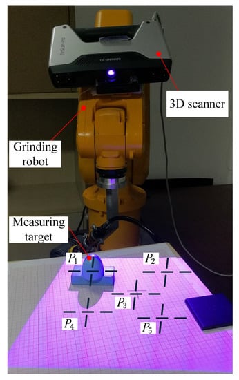The purpose of this experiment (Experiment 1) is to test the measurement accuracy of the 3D vision system proposed in this paper. The experimental scenario is shown in Figure 3. The grinding robot used here is manufactured by EFORT Intelligent Equipment Co., Ltd (Wuhu, China), the product model is ER3A-C60, the load is 3 kg, the working range is 1.256 m, and the repeat positioning accuracy is ±0.02 mm. The 3D scanner used here is manufactured by SHINING 3D TECH. (Hangzhou, China), the product model is EinScan-Pro, the fixed scanning accuracy is 0.05 mm, the measuring distance is 350 mm–450 mm, the nominal size of the 3D scanner’s field of view is 210 mm × 150 mm at the best measurement distance, and the scanner is fixed on the robot’s fourth joint and does not interfere with the regular rotation of all robot joints.