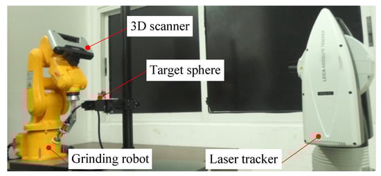 The calibration experiment platform for the vision measurement system of the grinding robot is shown in Figure 4, including a grinding robot, a 3D scanner, a target sphere, and a laser tracker. The grinding robot and the 3D scanner used here are the same as in Experiment 1. Moreover, the laser tracker used here is manufactured by Hexagon Manufacturing Intelligence, and the model number is Leica AT960-MR (Hexagon Manufacturing Intelligence, Unterentfelden, Switzerland). It is a laser measurement system with a powerful dynamic six-degrees-of-freedom (6DoF) function with a measurement accuracy of ± 15 µm + 6 µm/m when measured with a reflective ball, and optical centring accuracy is ±3 µm. The target sphere used here is a standard reflection sphere used with the Leica AT960-MR laser tracker.