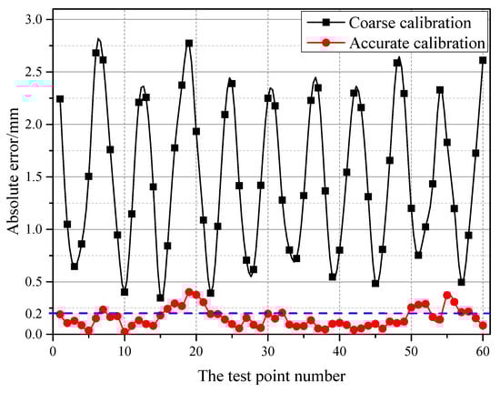 Comparison of the absolute error of the measurement results of the visual system after coarse and accurate calibration.