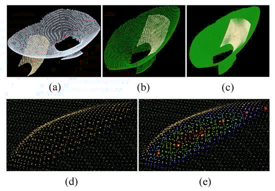 Point cloud and machining path point information in the detection process of the machining target. (a) Unregistered point cloud pair; (b) Coarse registration; (c) Accurate registration; (d) Difference point cloud; (e) Machining path points.