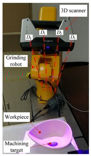 However, some scholars have studied the visual system of grinding robots. The purpose of their research is usually to improve the processing efficiency of grinding robots. Their research contents are as follows: Dieste et al. [] proposed a novel grinding system based on robotics and artificial vision. The application of this novel system has allowed reducing the failed parts due to finishing process down to zero percent from 28% of rejected parts with a manual grinding process. The reduction in process time consuming, and amount of scrapped parts has reduced the energy consumption up to 30% in the finishing process, and 20% in the whole manufacturing process for an injection moulded aluminium part for the automotive industry with high production volumes. In the study of Hosseininia et al. [], Machine vision technology and image processing techniques are employed, implemented and integrated with the current robotic system to detect the pose (position and orientation) of biscuits, hence guiding the robot arm to perform its grinding operation at the correct and most efficient pose. Princely et al. [] proposed a Vision-Guided Robotic System (VGRS) methodology for the deburring of workpieces to eliminate the weakness of “Teach” or “Offline” programming methodologies. In this proposed system the shape of the two-dimensional workpiece is acquired for each workpiece, and the robot-language program is generated automatically from the workpiece shape data and finishing condition data. Ji et al. [] described an autonomous robot developed to implement wall grinding work. It is designed to implement wall grinding work which belongs to the fundamental wall finishing works and is harmful to workers due to the accompanied dust. The proposed robot system consists of a structured light-based 3D scanner, and a robot arm (UR5, Universal Robots, Odense, Denmark) fixed on a mobile platform. The 3D scanner is adapted for recognising the defects on the wall surface and measuring its roughness. These scholars have been added visual systems to their robots, which significantly improve the level of intelligence of robots. However, the research on installing 3D scanners on the middle joint of a robot is rare because the difficulty of such solution is needed to overcome the problem of how to obtain machining information through point cloud analysis and how to accurately calibrate the robot 3D vision system.