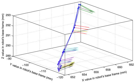 We divide the measurement space into three layers evenly in the height direction, and then regularly choose three positions from each layer. When measuring the spherical coordinates of the target sphere placed at each position, the 3D vision system is performed from six different directions, thus obtaining 54 equations as shown in Equation (17). The detection error compensation amount can be obtained by solving the equations shown in Equation (18) by using the method of Equation (19). After accurate calibration, the coordinate transformation matrix of the scanner frame to the robot’s fourth joint frame is: