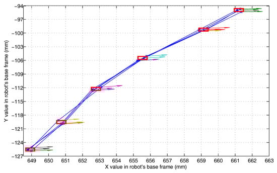 It can be seen from Figure 9 that the four curves (machining paths) are almost coincident. To study the discreteness of the machining path points on the curve, we project the four curves of Figure 9 on the XY, XZ, and YZ plane respectively to obtain Figure 10, Figure 11 and Figure 12. In Figure 10, Figure 11 and Figure 12 we can see that there are six machining path points on each curve. To see the discreteness of the corresponding machining path points in the three directions X, Y, and Z, we use the squares with a side length of 0.5 mm to surround the machining path point in Figure 10, Figure 11 and Figure 12. From Figure 10, Figure 11 and Figure 12, it can be found that the corresponding machining path points can be surrounded by the square with a side length of 0.5 mm. This proves that the 3D vision system proposed in this paper has high stability of repeated detection, and the absolute measurement accuracy of the 3D vision system caused by the compound error is about 0.25 mm. Such detection accuracy can satisfy the grinding of the workpiece with general accuracy requirements because the radius of a grinding tool is usually much larger than the detection error. It is worth noting that: (1) Figure 10, Figure 11 and Figure 12 show that squares with a side length of 0.5 mm are rectangular because the scale of the axes is different. (2) The arrows with different colours shown in Figure 9, Figure 10, Figure 11 and Figure 12 indicate the normal direction of the machining path points detected by the 3D vision system, but this paper does not accurately measure the error in the normal direction because on the one hand, the normal direction of the machining path point is difficult to measure, and on the other hand, the normal measurement error is usually positively correlated with the measurement error of the corresponding point position.