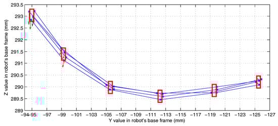 This experiment (Experiment 5) is used to test the effect of the compound error caused by the scanner measurement error, the point cloud registration error, the robot motion error, and the visual system calibration error on the detection accuracy of the 3D vision system. The experimental scenario is shown in Figure 8. The grinding robot and the 3D scanner used here are the same as in Experiment 1. In the experiment, we fix the workpiece in the same position in the measurement space. The grinding robot 3D vision system detects the machining target on the workpiece from four different orientations , , , and , respectively, and extracts the corresponding machining path points as machining information. Figure 9 is the curves (machining paths) obtained by connecting machining path points in the robot base frame. Figure 10, Figure 11 and Figure 12 are the projections of the curves shown in Figure 9 on the XY, XZ, and YZ plane, respectively.