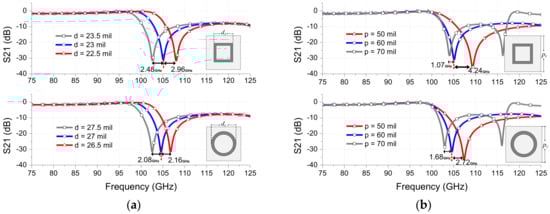In the design, firstly, the loop width “w” should be chosen, since w strongly affects both the resonant frequency and the Q-factor of the FSS filter as shown in Figure 5. Figure 5a shows the variation of resonant frequencies as changing w with fixing d, p and g parameters. When w is increased, the inductance of the loop becomes smaller and thereby the resonant frequency is significantly increased with some improvement of rejection level. The Q-factor of the FSS filter, however, is decreased with the increase of w as shown in Figure 5b, which shows the FSS frequency responses by changing w and adjusting d with fixing p and g parameters to have the resonant frequency of 105 GHz. As can be seen, the higher Q-factor from the FSS filter can be obtained with a smaller value of w, which can be often limited by the fabrication tolerance. Therefore, w can be chosen to satisfy the low-loss passband requirement and the Q-factor. In this design, w is chosen as 4 mil by considering the used chemical etching fabrication condition.