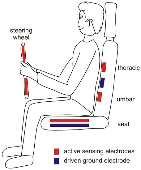 Later in 2008, Chamadiya and colleagues from the Karlsruhe Institute of Technology (KIT) presented a concept integrating textile capacitive electrodes into a W221 Mercedes S-Class seat [43]. In this specific design, the electrodes were placed horizontally and rather lateral as the chosen seat already carried several other technical devices (ventilator, massage unit). However, this lateral electrode placement seems suboptimal as it may result in reduced body contact areas and subsequent lower coverage.