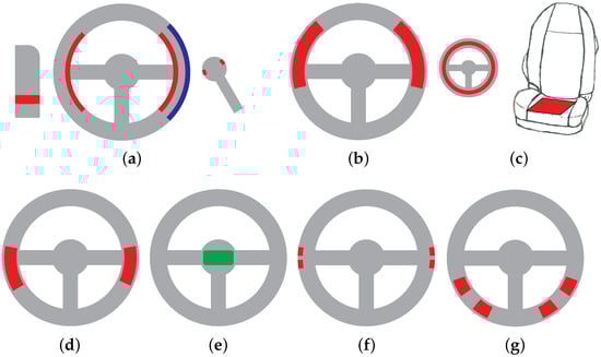Overview of several designs for contact-based ECG monitoring (red: active electrodes, blue: driven ground electrode, green: electronics, precise electrode position on steering wheel not revealed): (a) Jeong [20]; (b) Lee [21], Silva [29], Vavrinsky [30,31]; (c) Matsuda [32], Xu [33]; (d) Heuer [25]; (e) D’Angelo [27]; (f) Gomez-Clapers [28]; (g) Jung [24].