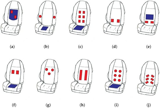 Overview of several low-contact ECG electrode arrangements and their year of introduction to the public (red: active electrodes, blue: driven ground electrode). (a) SMART seat (Leonhardt, 2008) [42]; (b) Daimler S-Class (Chamadiya, 2008) [43]; (c) Ford S-Max (Eilebrecht, 2011) [44]; (d) Daimler car (Chamadiya, 2011) [58]; (e) Audi Q5 (Schneider, 2012) [48]; (f) Car seat (Jung, 2012) [49]; (g) EPIC System (Plessey, 2014) [59]; (h) Ford S-Max (Leicht, 2014) [60]; (i) Ford car (Leicht, 2015) [61]; (j) WARDEN (Plessey, 2017) [52].
