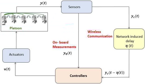 The following Figure 2 represents the structure of networked control platoon. The local control law (8) is achieved by dividing the output vector into two parts , and . Clearly, the spacing error can be directly measured by on-board sensors, whereas the rest of signals are affected by the communication network.