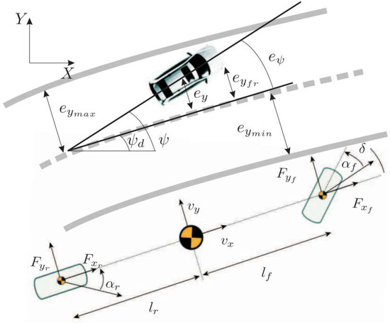 The simple kinematic vehicle model is used for simpler control of the vehicle dynamics during avoidance screenplay. Then, the single track vehicle model characterizing planar vehicle motion is depicted in Figure 3.