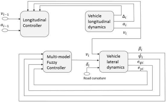 In many studies [11,13], the vehicle platoons are modelled as one-dimensional systems controlled in the longitudinal direction relies on some assumptions. However, in our contribution, we consider also the lateral dynamic in order to include the lane change maneuver representing the real conditions of road traffic. Therefore, to allow the road convoy within a designated lane, control of both the longitudinal and lateral motion of the vehicle is required. The primary goal of the lateral control is to ensure convenient tracking performance in spite of the coupling effects due to longitudinal speed variation. In [14], the following cars equipped with low-level longitudinal (controlling speed) and lateral (controlling steering) control systems, travel in a platoon with predefined gaps between them. In order to linearize the lateral dynamic, TS fuzzy modeling is adopted [15,16,17], and the proposed automatic lane keeping method can handle a large change area of vehicle speed. Furthermore, Taylor’s approximation process is used to significantly minimize the computational perplexity of the vehicle TS fuzzy model [18].