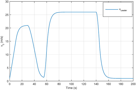 In order to evaluate the performance of the proposed control approaches, simulations are carried out for a car following scenario by simulating a platoon consisting of six vehicles. The speed profile of leader vehicle is shown in Figure 5 and summarized as follows: