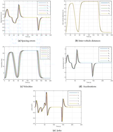 The safety of the platoon in case of an emergency braking is shown in Figure 6c. The inter-vehicle distances are always greater than zero, so no collision occurs. We remark that accelerations for all following vehicles are equal to 3.1 m/s2, which corresponds to the comfort acceleration limit. In addition, Figure 6e highlights that the jerk (which is the acceleration’s time derivative is the best way to exhibit a human comfort criteria.) magnitude is reasonably lower than 2 m/s3 as defined in [33].