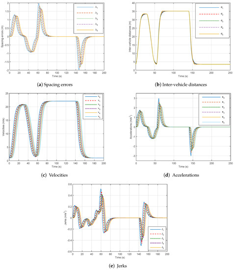 Thus, in order to handle the stability and performance of the platoon, despite the effects of the network communication, we have tested the proposed method of Theorem 1 in this paper with considering delay in the control design with (47). The following remarks can be deduced: