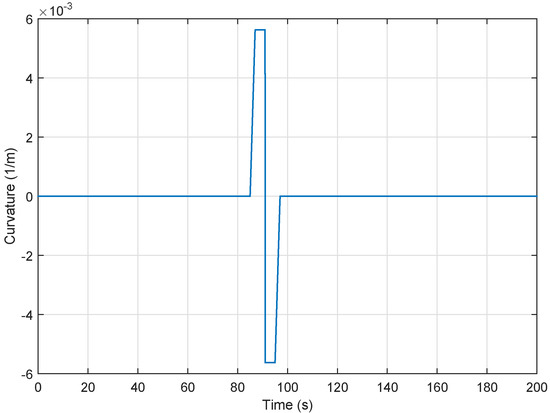 In this subsection, we assess the performance of the proposed lateral control approach. In the lateral control simulation, we consider the curvature of the road traversed by the vehicle platoon shown in Figure 10 and also the trajectories depicted in Figure 11. Then, using the parameters for , the delay lower bound 6 ms, upper bound 30 ms, Theorem 3 produces a feasible solution with the following gains matrices: