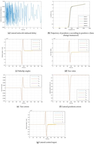 Vehicle simulation results have been performed over the lane change maneuver for the fuzzy lateral controller in Figure 11b. Thus, the states and control inputs of the lateral dynamics for followers are illustrated in Figure 11. Obviously, the suggested fuzzy TS controller improves stability and vehicles can track each other with minimal deviation in spite of the communication delays and the rather big variation in longitudinal velocity. As can be seen, the vehicle speed for this scenario strongly varies within its range . This clearly justifies the interest of the proposed TS fuzzy model-based control method.