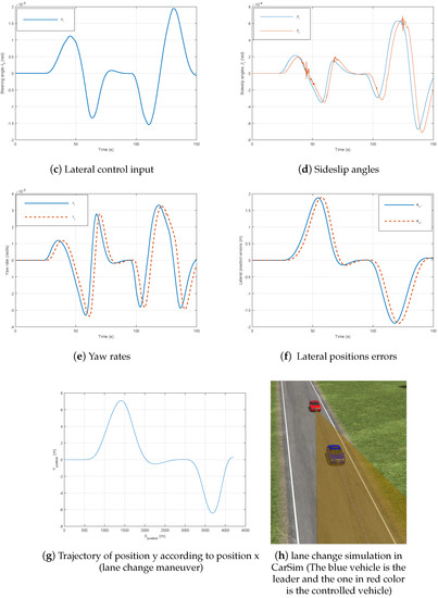 Thus, the platooning approach is verified by CarSim in an obstacle avoidance scenario (Figure 12g). A double lane change test (Figure 12h) is conducted with steering wheel angles depicted in Figure 12c. In this simulation, the vehicles are driven at a variable speed (Figure 12b). We can see from the results shown in Figure 12a–g the good performance and efficiency of the proposed approach despite communication delays. In fact, the controlled vehicle managed to follow its preceding vehicle (leader).