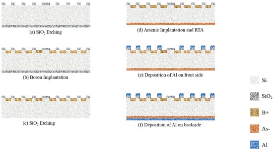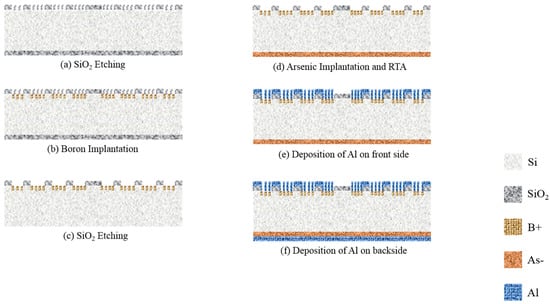 The schematic fabrication processes of the MA BSE detector. (a) Front side working areas. A 500 nm-silicon dioxide layer is etched. (b) Ion implantation of boron ions on front side. (c) A 500 nm-silicon dioxide on backside is etched. (d) Backside ion implantation by arsenic ions and then RTA treatment at 950 °C for 60 s. (e) A 600 nm-aluminum film is deposited on front side. (f) A 600 nm-aluminum layer is deposited on backside.