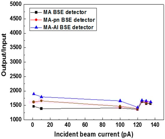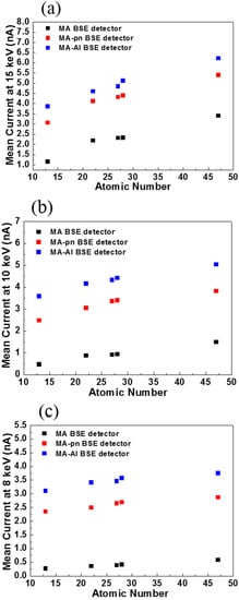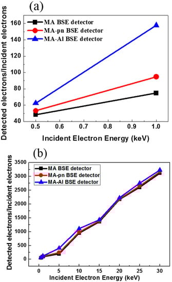 Figure 9a–c show that sensitivity to the atomic number for electron energy at 15 keV, 10 keV and 8 keV, respectively. For electron beam energy at 8 keV, the MA p-n and MA-Al detectors have 64% and 103% enhancement in sensitivity to the atomic number as compared with that of the MA BSE detector.