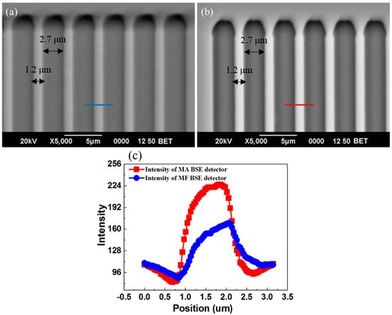 BSEs images of silicon microstructures. The width and depth of silicon micro cavity is 2.7 and 1.0 μm respectively. The spacing between each strip is 1.2 μm. BSE image recorded (a) with MF BSE detector and (b) with MA BSE detector. (c) The intensity profiles across the silicon strip in (a,b).