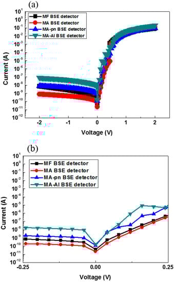 The basic diode characteristics of electrical performance for the MF, MA, MA p-n and MA-Al detectors were tested by measuring the I-V characteristics. We obtained typical I-V curves of detectors by multi-meter (Keithley 2635B, Tektronix Company Ltd., Shanghai, China) and put the detectors in SEM chamber to make sure that without illumination, as shown in Figure 7. As expected, the I–V characteristics show that these four detectors are ideal and uniform with low dark currents. The dark current of the MA, MA p-n and MA-Al detectors at zero bias are 20 pA, 100 pA and 150 pA, respectively. The dark current of 20 pA is very small and can be negligible in the detection of backscattered electrons. The MA p-n BSE detectors has a higher dark current 100 pA due to aluminum electrode which may directly contact with a non-doping layer of working area of the lateral p-n junctions structure (Figure 2). In addition, the dark current for the aluminum grids structure is 150 pA because that dark current will increase with increasing electrode area (Figure 3). Those can result in an undesirably high dark current.