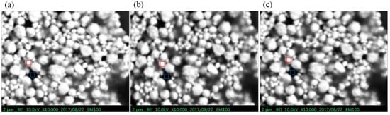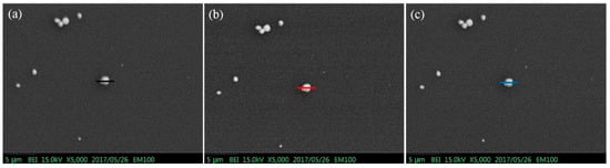 where ISignal and IBackground are the averaged intensity from the circled gold particle and the silicon substrate, respectively, while the σSignal and the σBackground are the standard deviation of these two parts, respectively. As shown in Figure 10, the contrast of images has been obtained at the electron energy of 10 keV. The mark of red square is for intensity of signal and the mark of blue square is for intensity of background. The image contrasts C for Figure 10a–c are 26.36, 29.61 and 30.61, respectively. According to the image contrast result, the MA-Al BSE detector has about 16% enhancement compared to the original MA BSE detector.