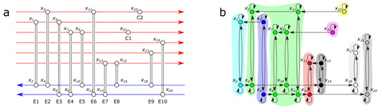 (a) the structure of the studied heat exchanger network represents how cold and hot streams influence each other; (b) the network representation of the state variables are related to the temperatures of the streams depicted in (a). Colors indicate strongly connected components.