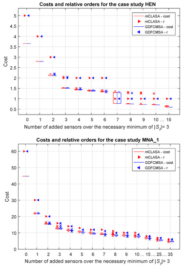 The values of the cost functions and relative degrees with regard to the number of added sensors in the case studies HEN and MNA_1. The box plots show the interquartile ranges and the medians of the cost functions, while the scatter plots visualize the minimum value of the relative order for 100 independent runs. For each value of the x-axis, the results provided by the mCLASA are shown on the left-hand side, and the results provided by the GDFCMSA algorithm are shown on the right-hand side. The triangles represent the relative orders, while the plus signs denote the outliers (if they exist) of the corresponding boxes.