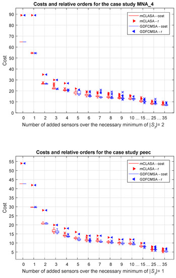 It is visible that in all cases both the cost functions and the relative orders of the observed state variables decrease significantly as the number of sensors increases, so a relatively small quantity of additional sensors can cause a noticeable improvement in terms of the relative order compared to the observer designed only to ensure observability. It can also be pointed out that additional sensors ( 25 or 35) do not significantly reduce the order of the system.
