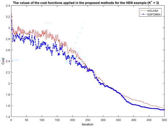 Analysis of the convergence with regard to the proposed methods in the case of the HEN. The colour red denotes the method mCLASA while the colour blue denotes the method GDFCMSA. It is clearly visible that the value of should be high because the methods also converge after 500 iterations. GDFCMSA provides a slightly better solution.