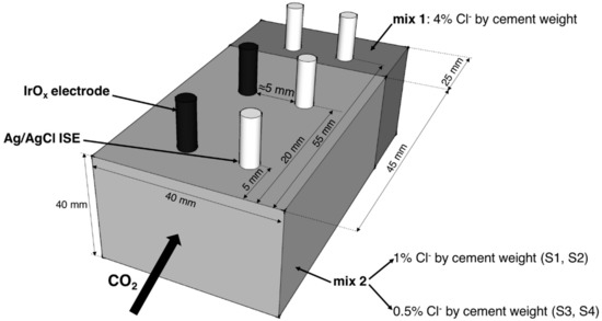 The mortar samples (Figure 2) consisted of two parts. Mortar prisms (4 × 4 × 2.5 cm3) with two embedded Ag/AgCl ISEs (at the same cover depth) were first produced with mix proportions cement/water/sand 1:0.5:2, CEM I 52.5, sand size < 1 mm and containing 4% of chlorides by cement weight (mix 1 in Figure 2). One hour after casting, another 4.5 cm thick mortar layer (4 × 4 × 4.5 cm3) was cast on top of the previous samples (mix 2 in Figure 2) with two embedded Ag/AgCl ISEs and two embedded IrOx electrodes. The amount of admixed chlorides varied for this match-cast part: The first two prisms contained 1% of chlorides by cement weight while the last two prisms contained 0.5% of chlorides by cement weight. In total, one IrOx electrode and one Ag/AgCl ISE were embedded at 5 and 20 mm cover depths (mix 2), and two Ag/AgCl ISEs at 55 mm cover depth (mix 1). Each specimen was made from a different mortar batch.