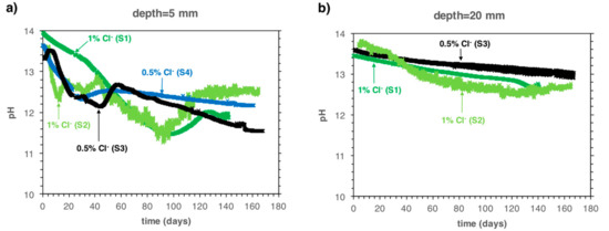 The electrodes embedded at a 5 mm depth indicate first a decrease from ca. pH 13.5 down to pH 12.8–12.2 for samples S3 and S4 (0.5% admixed chlorides by cement weight). Subsequently, the pH increased back to about pH 12.5 within a few days. Afterwards, the pH slowly decreased further, reaching pH 12–11.5 after approximately 160 days of CO2 exposure. For samples with 1% admixed chlorides by cement weight (S1 and S2), the pH decrease was generally delayed, but somewhat more pronounced: it reached a value of pH ≈ 11.5 after 100 days in the carbonation chamber, then it increased back to pH ≈ 12.5 during the next 20 days and it remained constant at that value after about 140 and 165 days of CO2 exposure for samples S3 and S4, respectively. In a previous work [34], it was indicated that the pH decrease to pH < 12.5, followed by the increase back to 12.5 (where it remains constant for some time) is likely due to the kinetically limited dissolution of Portlandite (which acts as a buffer maintaining the pH constant at ≈12.5), especially under conditions of accelerated carbonation.