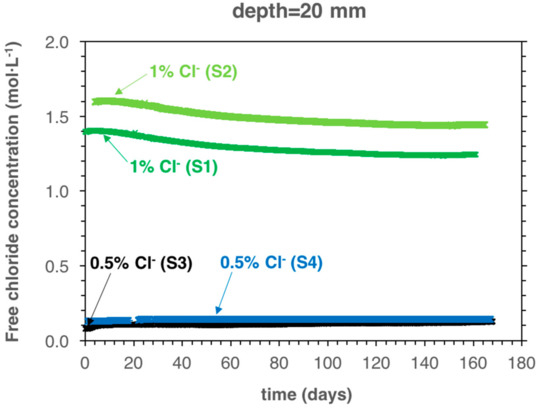 Figure 4 shows the measured free chloride concentration at 20 mm cover depth as a function of exposure time in the carbonation chamber for the different specimens (Table 1). At 20 mm cover depth, where no significant pH changes occurred during the exposure time in this study (Figure 3b), the free chloride concentration decreased only slightly (0.1 mol·L−1) for samples S1 and S2. At such high chloride concentrations (>1.3 mol·L−1), a difference of 0.1 mol·L−1 corresponds to a difference of about 10 mV in the potential-chloride activity curve (Equation (1)). Such differences in the calculated electrode potential (Equation (1)) may thus be caused by assumptions made in the calculation procedure [27].